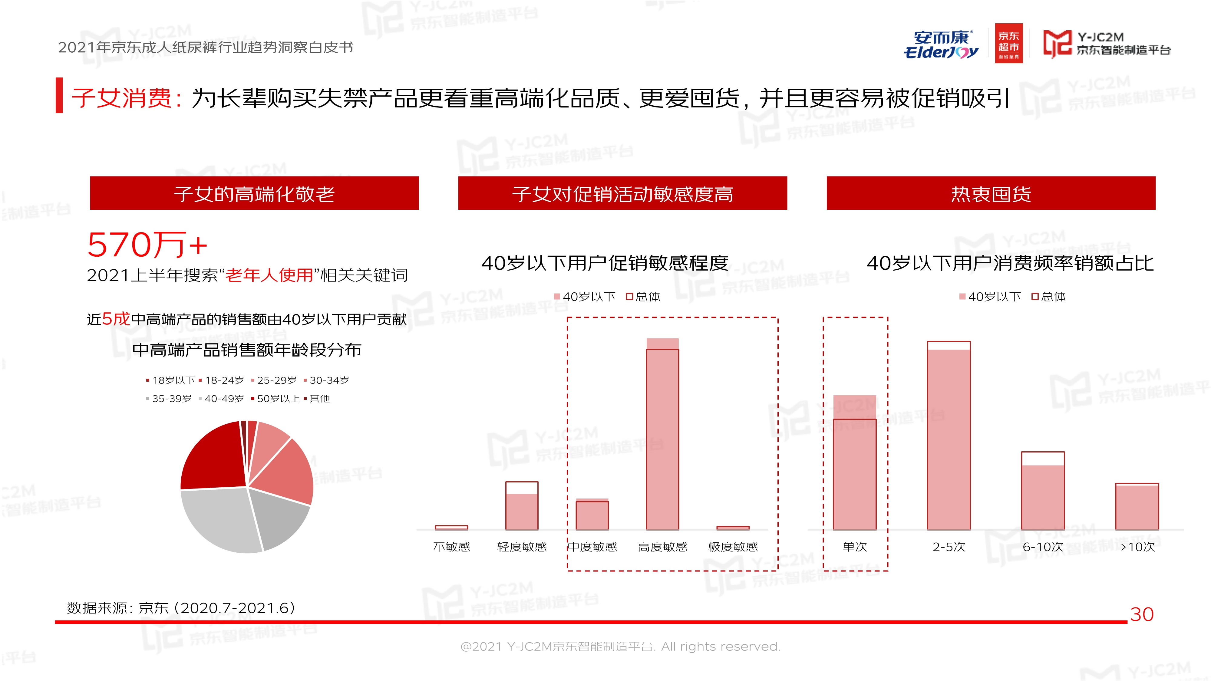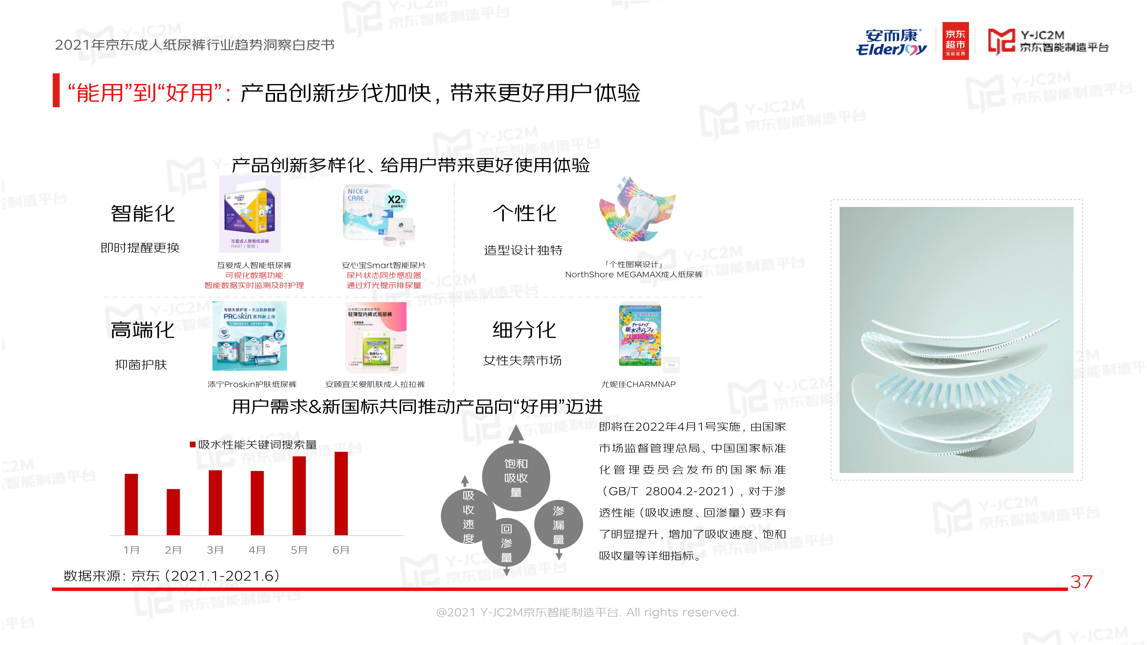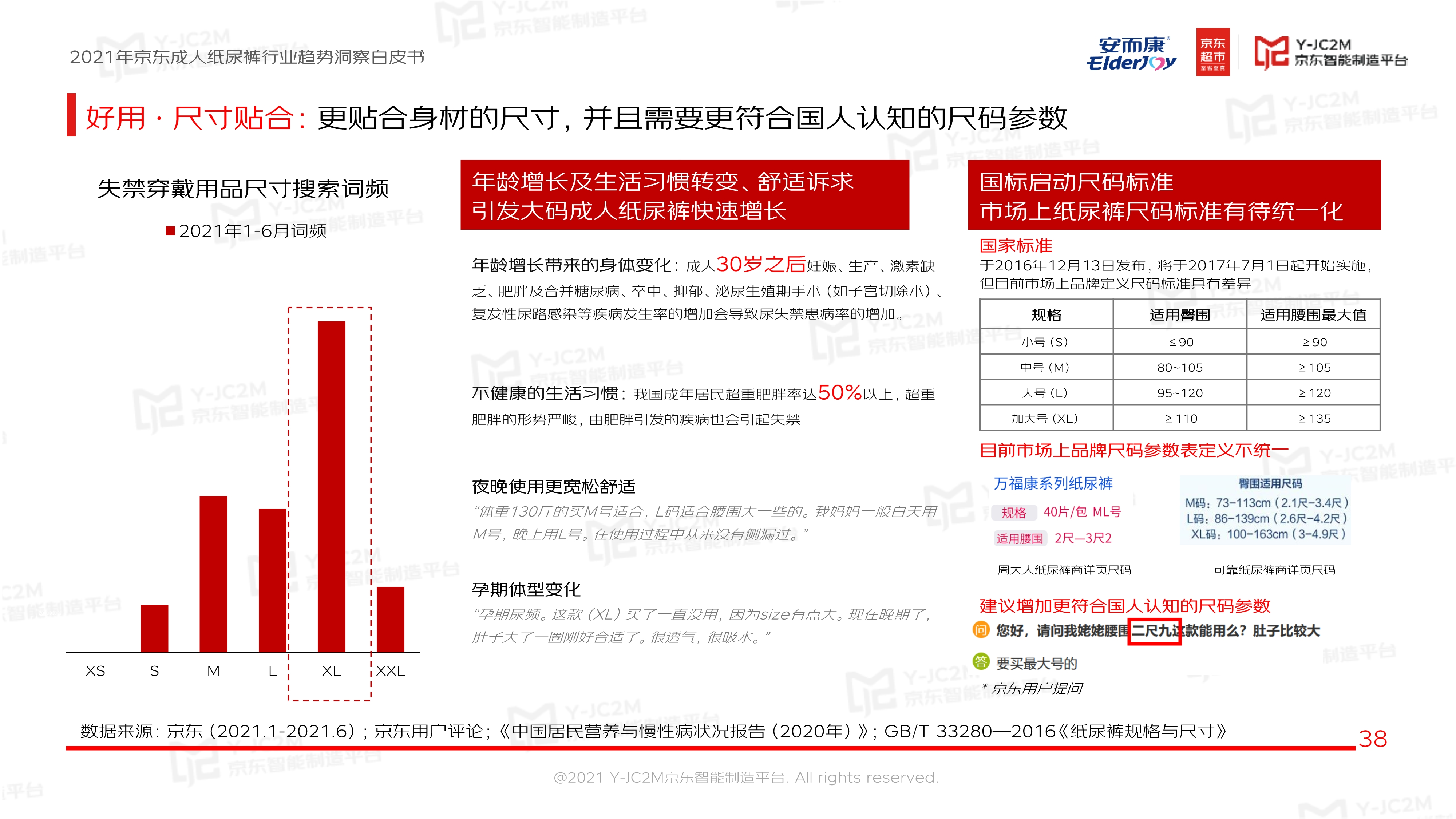 时段: 2023-01-07近日,掌中彩welcome旗下成人纸尿裤品牌安而康联合京东智能制造平台共同发布《2021年京东成人纸尿裤行业趋势洞察白皮书》(下称《白皮书》),从行业概况、品牌格局、用户洞察、趋势展望四个维度,结合销量数据与消费者,深入剖析了随着我国步入老龄化社会以及消费观念不断升级,国内纸尿裤市场的全新变化与发展趋势。