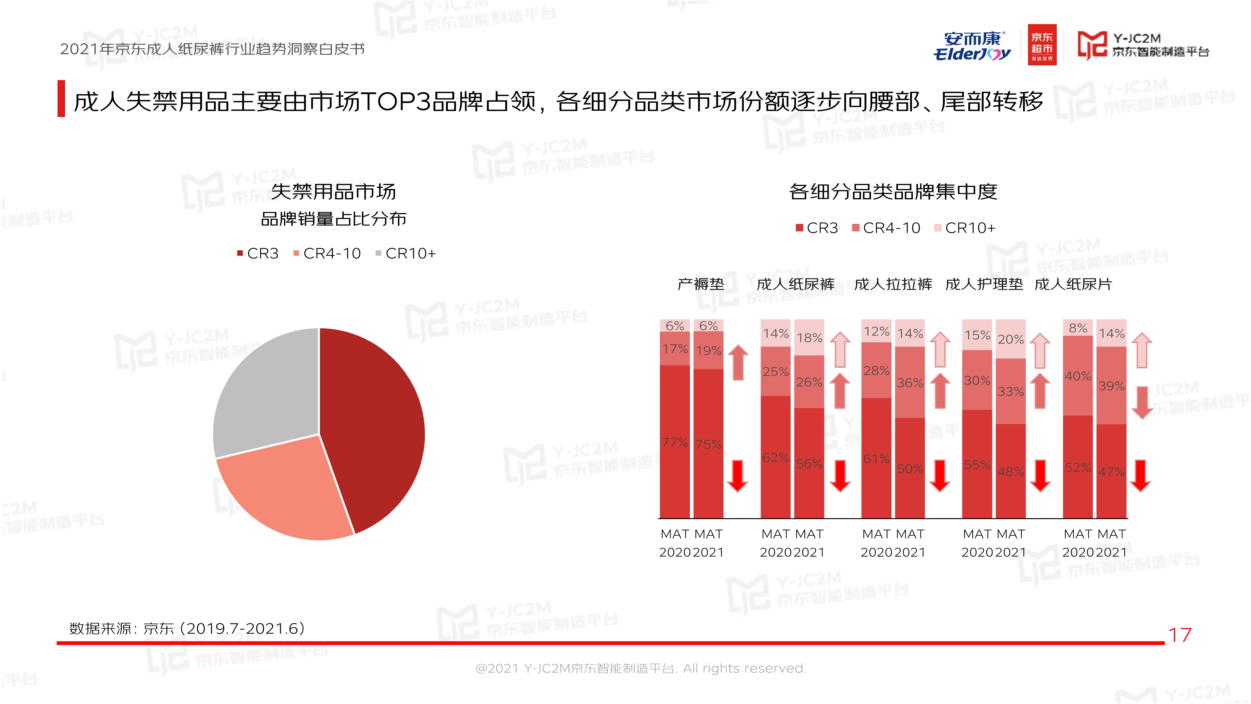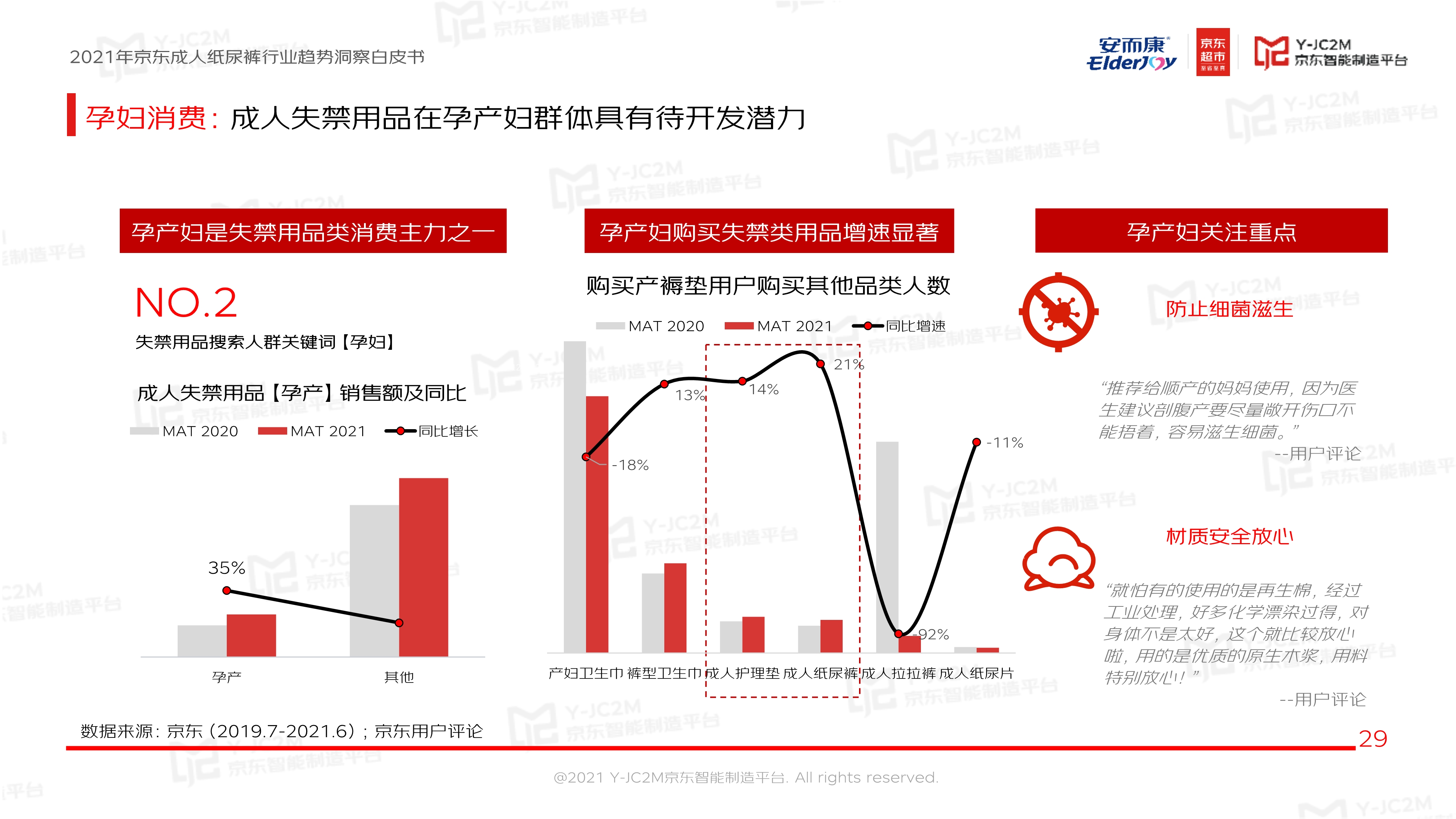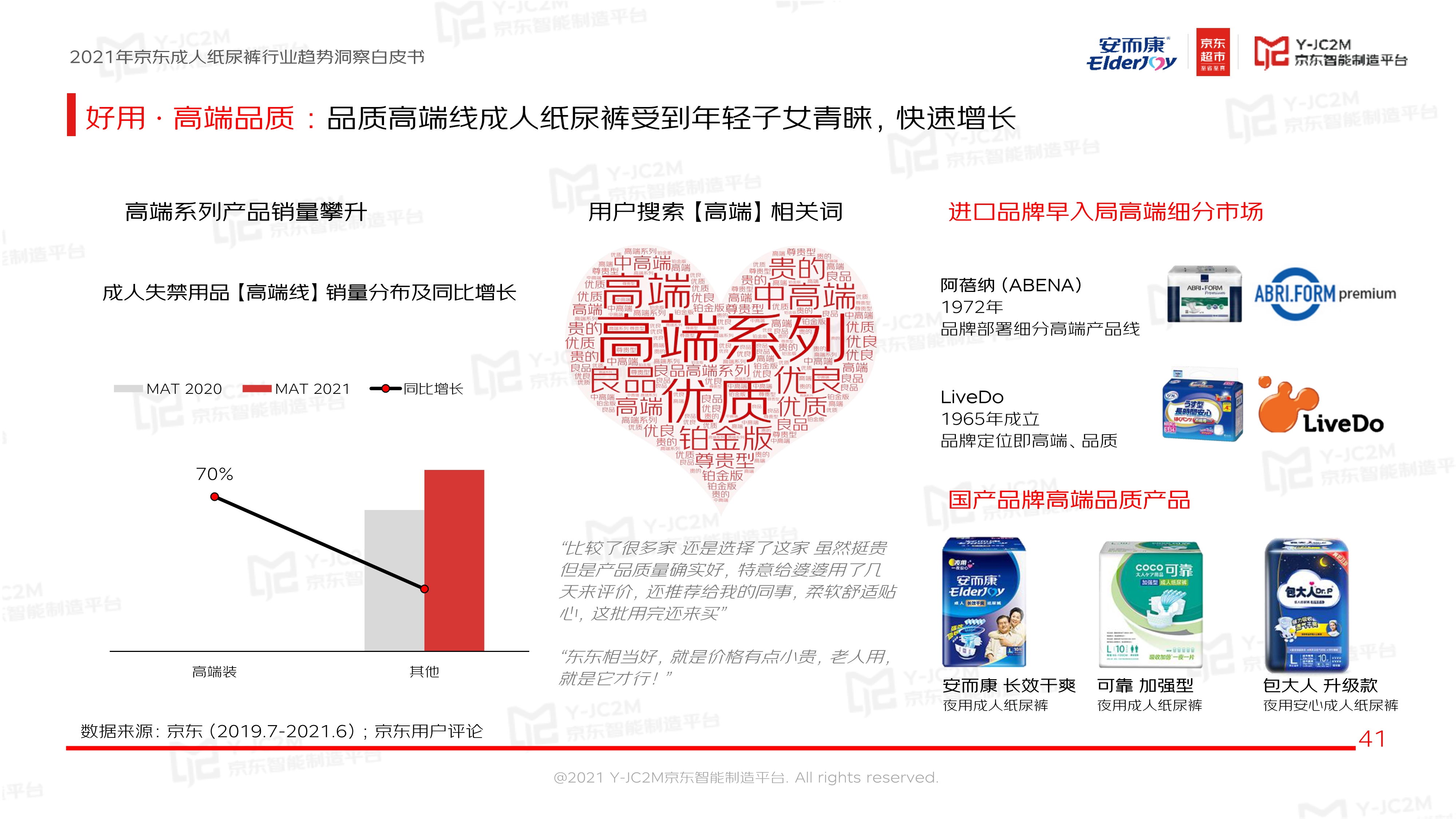 时段: 2023-01-07近日,掌中彩welcome旗下成人纸尿裤品牌安而康联合京东智能制造平台共同发布《2021年京东成人纸尿裤行业趋势洞察白皮书》(下称《白皮书》),从行业概况、品牌格局、用户洞察、趋势展望四个维度,结合销量数据与消费者,深入剖析了随着我国步入老龄化社会以及消费观念不断升级,国内纸尿裤市场的全新变化与发展趋势。